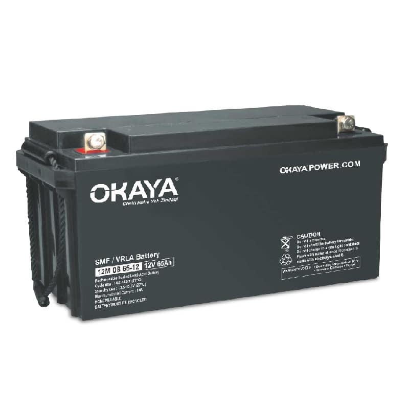 تعد بطاريات OKAYA SMF (الخالية من الصيانة المختومة) والمعروفة أيضًا باسم بطاريات حمض اللوائح المُحكمة القيمة (VRLA) هي بطاريات الألواح المسطحة التي لا تتطلب تصدُّرها ، وعادةً لا تنبعث منها أي أبخرة أو غازات بصفة مستمرة. إنها محكمة الغلق تمامًا وبالتالي تقلل من خطر انسكاب الحمض أثناء النقل. بسبب بنائها ، يمكن تركيبها في أي اتجاه ولا تتطلب صيانة مستمرة. هذه تستخدم للتطبيقات المتطورة للطاقة الاحتياطية مثل UPS ، المحول الكهربائي ، اتصالات السكك الحديدية ، أنظمة الأمن ، إلخ.