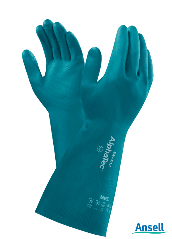 طلاء Ansell Alphatec Nitrile ، بطانة Aquadric ، تصميم ذو قبضة معكوسة ، نمط صفعة Gaunlet ، أخضر زجاجي ، 380 مم ، 0،45 مم (Nitrile) + 0.35 مم (AquaDri 2).