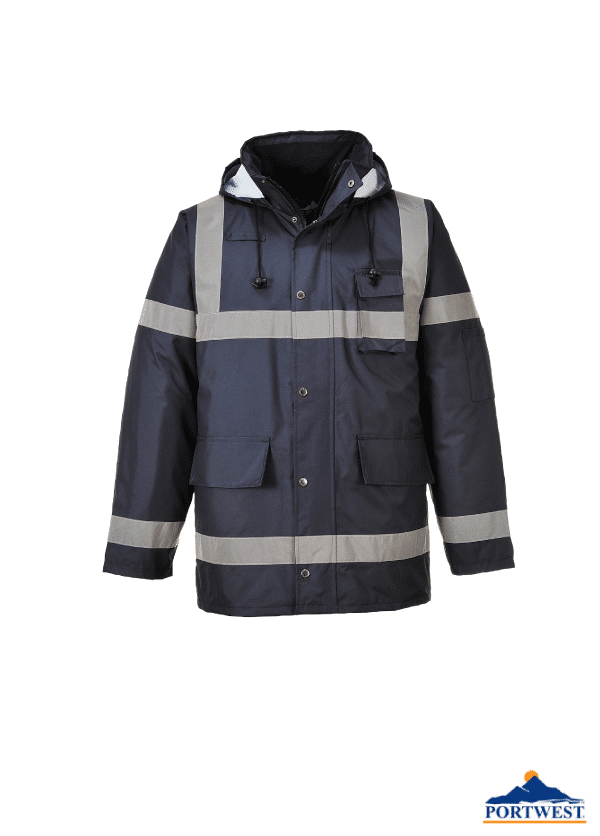Portwest Shell: بوليستر 100٪ ، نسج أكسفورد 300D بنهايات مقاومة للبقع ، مطلي بـ PU: EN 343 ، EN 342 - اللون الأزرق الداكن.