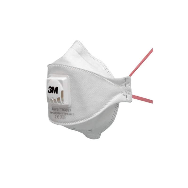 3M™ Aura™ 9332+ Particulate Respirator Mask, FFP3, Valvedprovides FFP3 breathing protection with a flat-fold, 3-panel design, low breathing resistance, and an embossed, sculpted top panel that can help reduce eyewear fogging. It features an innovative chin tab for easy adjustments, and the headbands are color-coded for quick and easy identification.