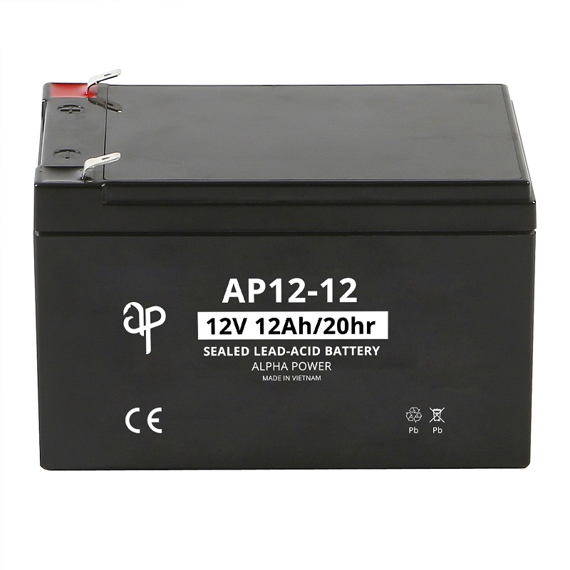 Alpha Power AP12-12 [12V 12Ah] VRLA AGM Battery is a Lead Acid rechargeable battery. The dilute sulfuric acid electrolyte is absorbed by separators and plates and thus immobilized. Should the battery be accidentally overcharged producing hydrogen and oxygen, special one-way valves allow the gases to escape thus avoiding excessive pressure build-up. Otherwise, the battery is completely sealed and is, therefore, maintenance-free, leak-proof, and usable in any position.
