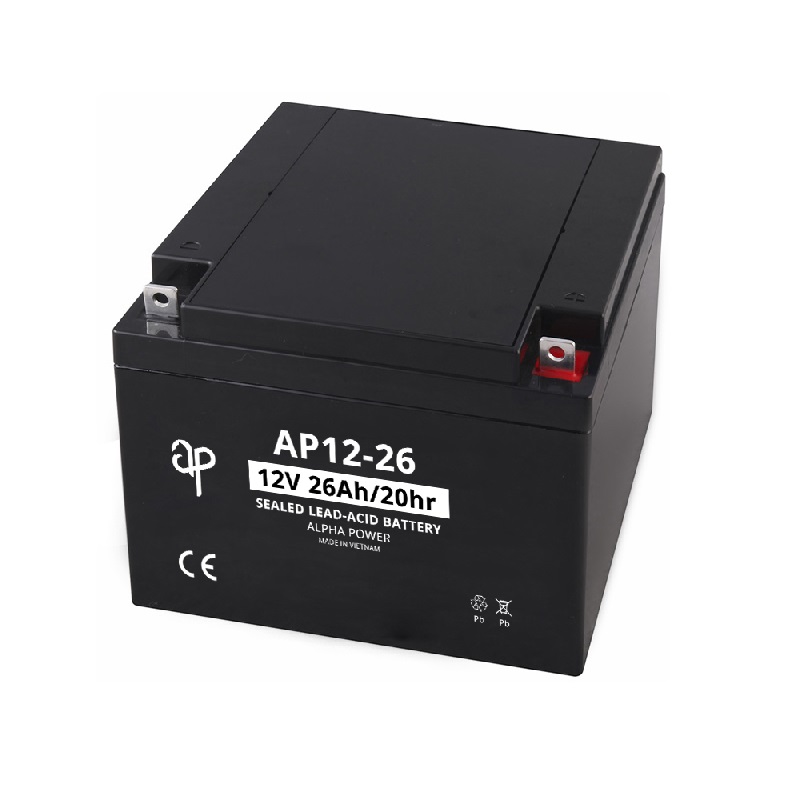 Alpha Power AP12-26 [12V 26Ah] VRLA AGM Battery is a Lead Acid rechargeable battery. The dilute sulfuric acid electrolyte is absorbed by separators and plates and thus immobilized. Should the battery be accidentally overcharged producing hydrogen and oxygen, special one-way valves allow the gases to escape thus avoiding excessive pressure build-up. Otherwise, the battery is completely sealed and is, therefore, maintenance-free, leak-proof, and usable in any position.