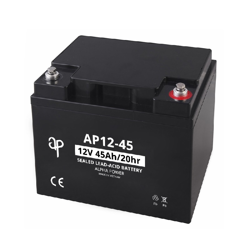 Alpha Power AP12-45 [12V 45Ah] VRLA AGM Battery is a Lead Acid rechargeable battery. The dilute sulfuric acid electrolyte is absorbed by separators and plates and thus immobilized. Should the battery be accidentally overcharged producing hydrogen and oxygen, special one-way valves allow the gases to escape thus avoiding excessive pressure build-up. Otherwise, the battery is completely sealed and is, therefore, maintenance-free, leak-proof, and usable in any position.