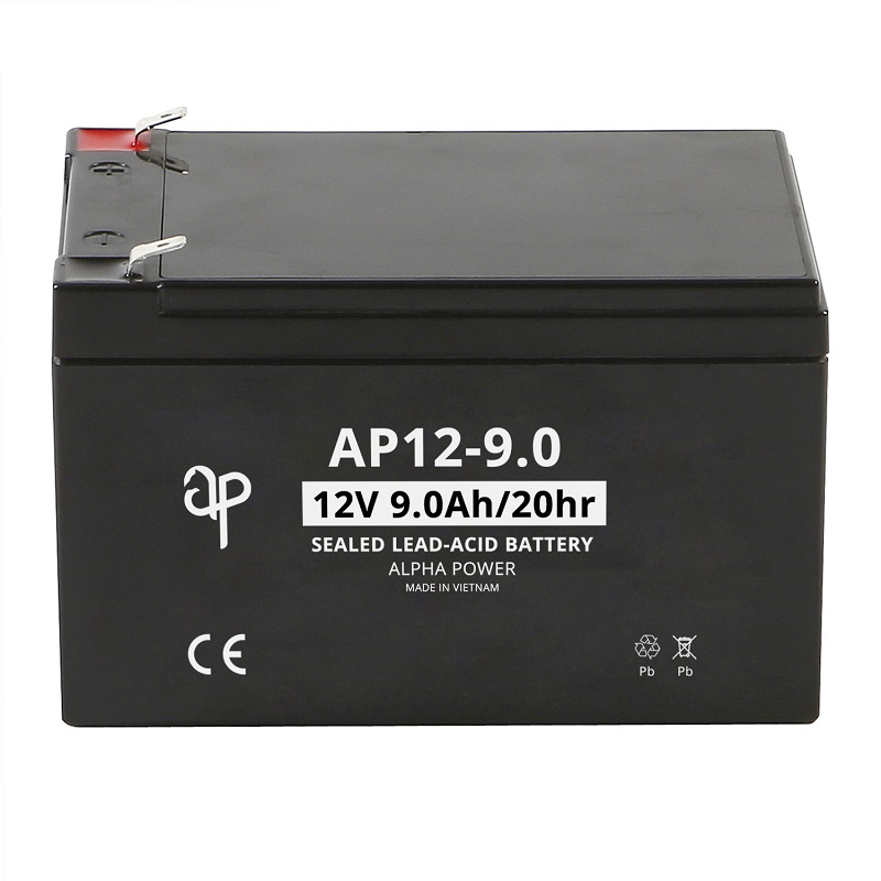 Alpha Power AP12-9.0 [12V 9Ah] VRLA AGM Battery is a Lead Acid rechargeable battery. The dilute sulfuric acid electrolyte is absorbed by separators and plates and thus immobilized. Should the battery be accidentally overcharged producing hydrogen and oxygen, special one-way valves allow the gases to escape thus avoiding excessive pressure build-up. Otherwise, the battery is completely sealed and is, therefore, maintenance-free, leak-proof, and usable in any position.