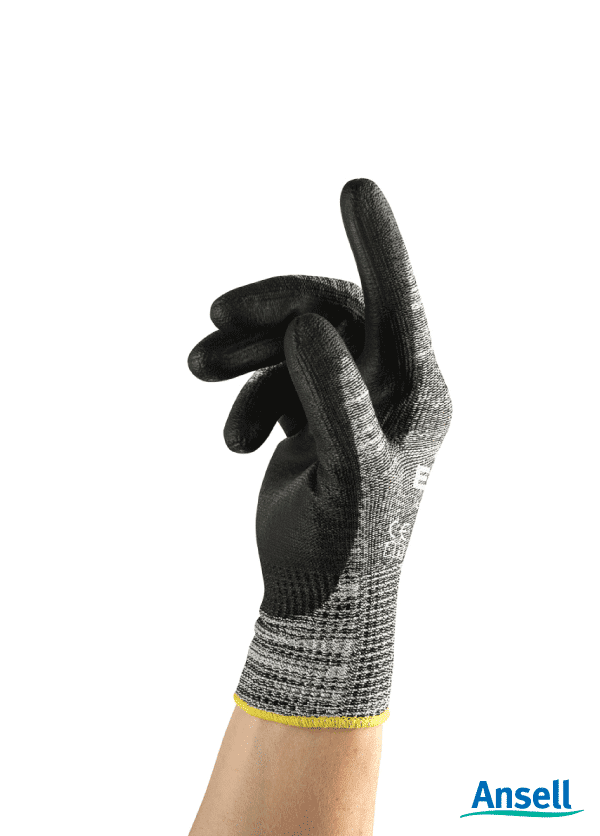 Ansell EDGE Knitted Spandex Nylon HPPE Glass Fiber, Polyurethane Coating, Palm dipped finishing, knitwrist cuff, Black and Grey, 220-270mm length.