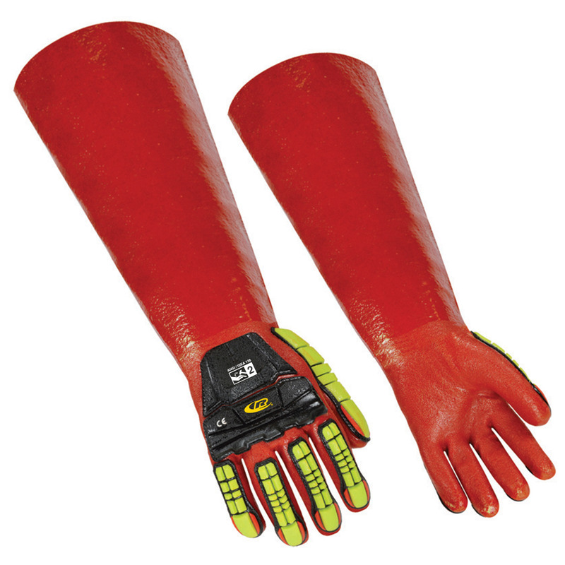 Extra long chemical resistant gauntlets with cut and impact protection. Aramid and glass fibre lining with waterproof PVC coating. TPR impact protection on the knuckles, fingers and metacarpal area. Textured sandy finish palm coating form improved grip. Bright, contrasting red and yellow colours for high visibility.