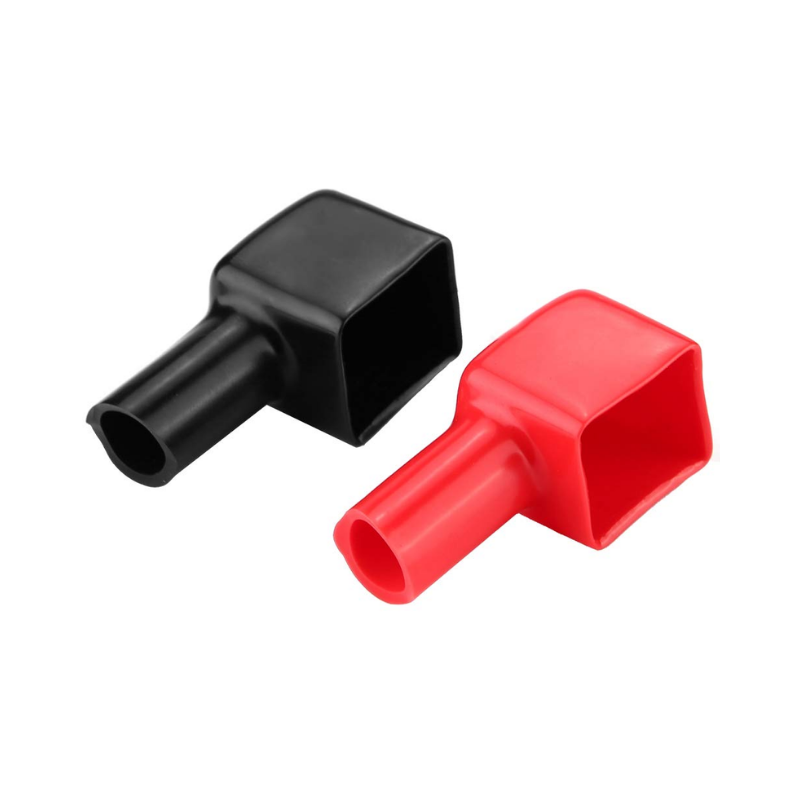 Insulated red and black battery terminal covers designed to protect battery terminals from dust, moisture, and accidental short circuits.