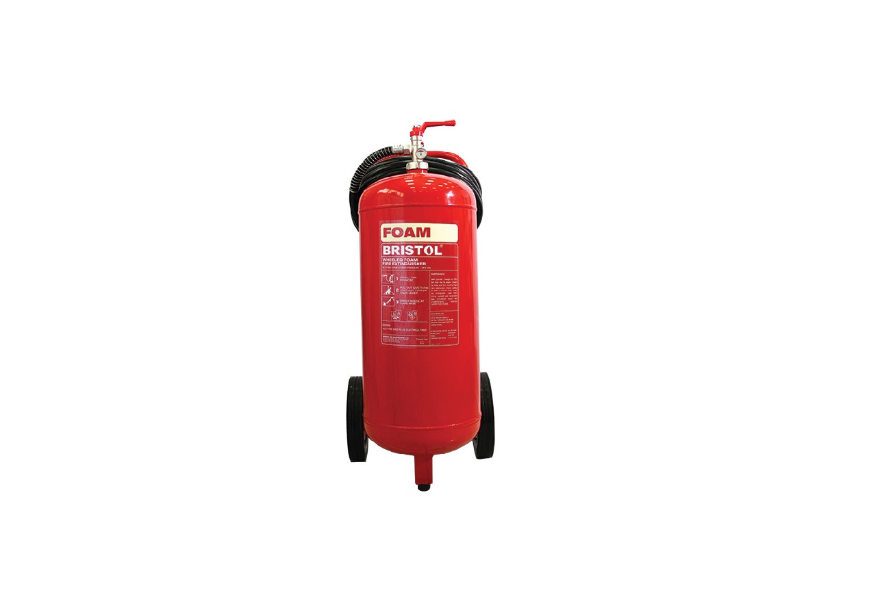 Bristol MFE10N 50L (10gal) Foam Trolley Pressure Type Extinguisher designed for fighting fires involving flammable liquids such as oil, gasoline, and other hydrocarbon-based fuels. This type of extinguisher is particularly effective for Class B fires. Class B fires involve flammable liquids or gases, and using the appropriate extinguisher is essential for effective firefighting.