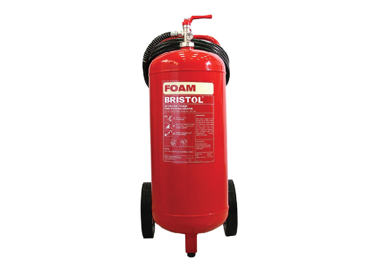 Bristol MFE35N 132L (35gal) Foam Trolley Pressure Type Extinguisher designed for fighting fires involving flammable liquids such as oil, gasoline, and other hydrocarbon-based fuels. This type of extinguisher is particularly effective for Class B fires. Class B fires involve flammable liquids or gases, and using the appropriate extinguisher is essential for effective firefighting.