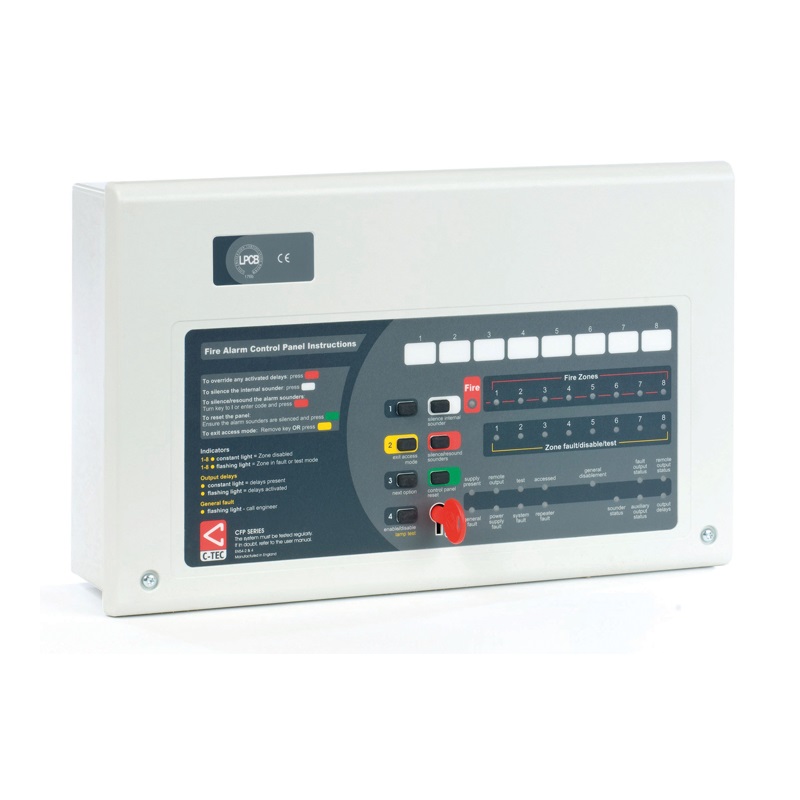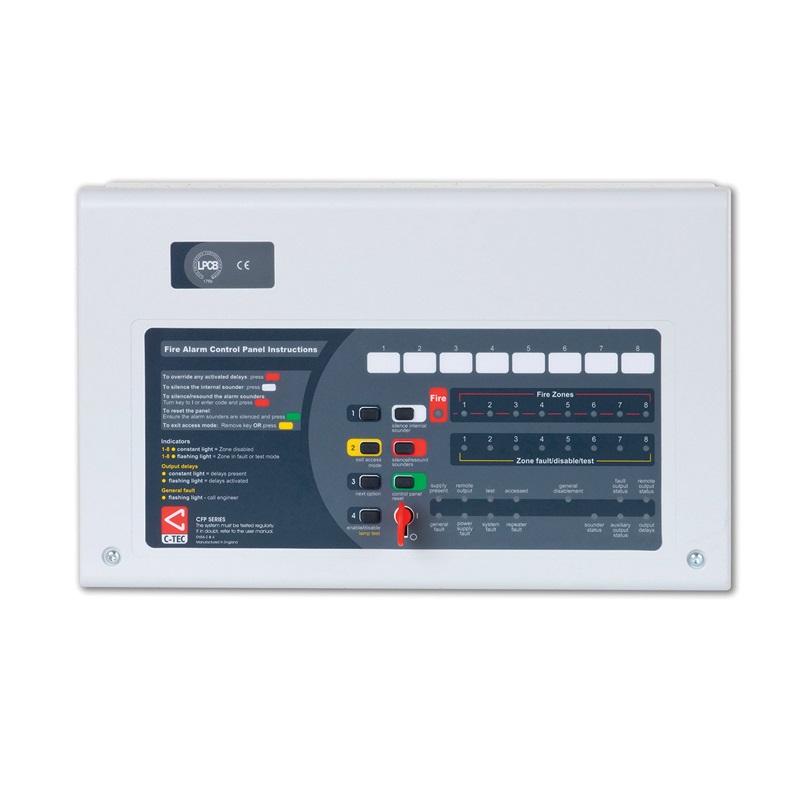 C-Tech CFP708-4 Standard 8 Zone Conventional Fire Alarm Panel, LPCB certified to EN54-2/4, C-TEC’s CFP 8 zone conventional fire alarm panel offers an array of user and installer-friendly features at a very competitive price. Supplied in an attractive flush or surface mountable plastic enclosure, it includes eight detector zones, four conventional sounder circuits, class change and alert inputs, on-board fire and fault relays and combined keypad/keyswitch entry.