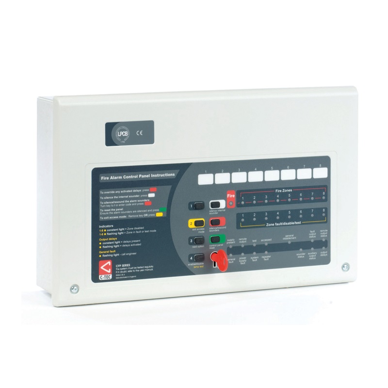 C-Tech CFP708E-4 Economy 8 Zone Conventional Fire Alarm Panel, LPCB certified to EN54-2/4, C-TEC’s CFP 8 zone economy fire alarm panel offers an array of user and installer-friendly features at a very competitive price. Supplied in an attractive flush or surface mountable plastic enclosure, it includes eight detector zones, four conventional sounder circuits, class change and alert inputs, four open collector outputs (fire, fault, reset and remote) and combined keypad/keyswitch entry. Unlike our Standard CFP fire panel, the CFP708E-2 is NOT compatible with CFP repeaters, relay expansion boards or EN54-13 interface cards. It also has limited engineering functions.
