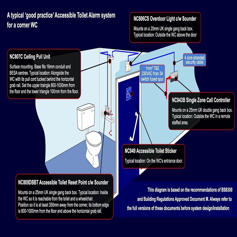 New ‘Call Accept’ functionality allows staff to send an intermittent call acknowledgment signal inside the WC to confirm help is on the way. Includes an NC943B 12V 140mA Call Controller c/w standby battery and relay, NC807C Ceiling Pull, NC806CS Overdoor Light c/w Sounder, NC809DBBT Accessible Toilet Reset Point c/w Sounder and NC949 Accessible WC Sticker. Can be wired in 4 core stranded security cable. Can also be used as a single zone emergency assistance alarm in changing rooms, solariums, interview rooms, reception areas and more.