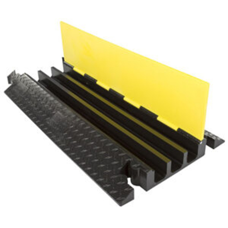 The 3 channel cable protector is used to secure cables and eliminate trip hazards for pedestrians accessing the area. Non slip design. Can be used in outdoor, indoor, work site, conference room, office and more. Ideal for backstage situations where combinations of cables are required. Creates a surface that trolleys can be wheeled over safely. Sections connect together to make up the protection length required.