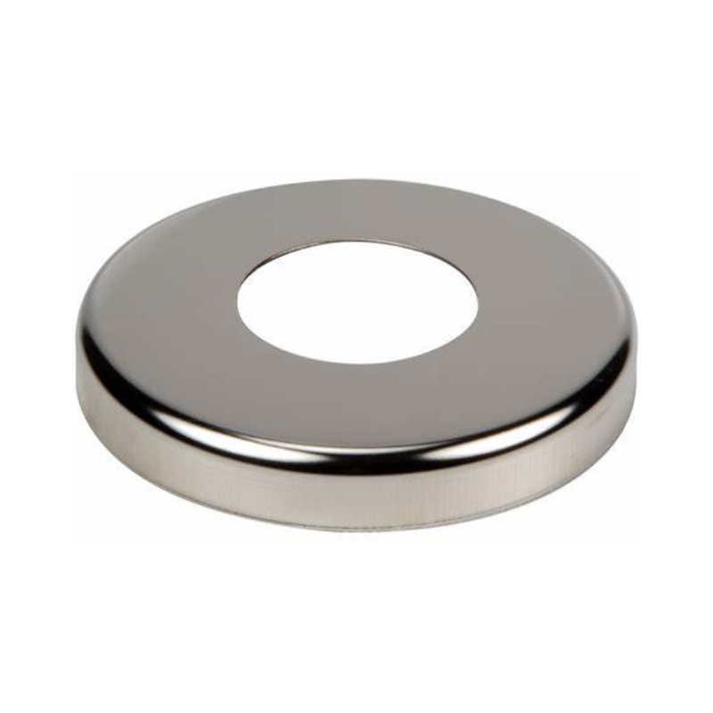 Chrome-plated round escutcheon plate designed to provide a clean finish around fire sprinkler heads, ensuring both aesthetic appeal and functional integrity.