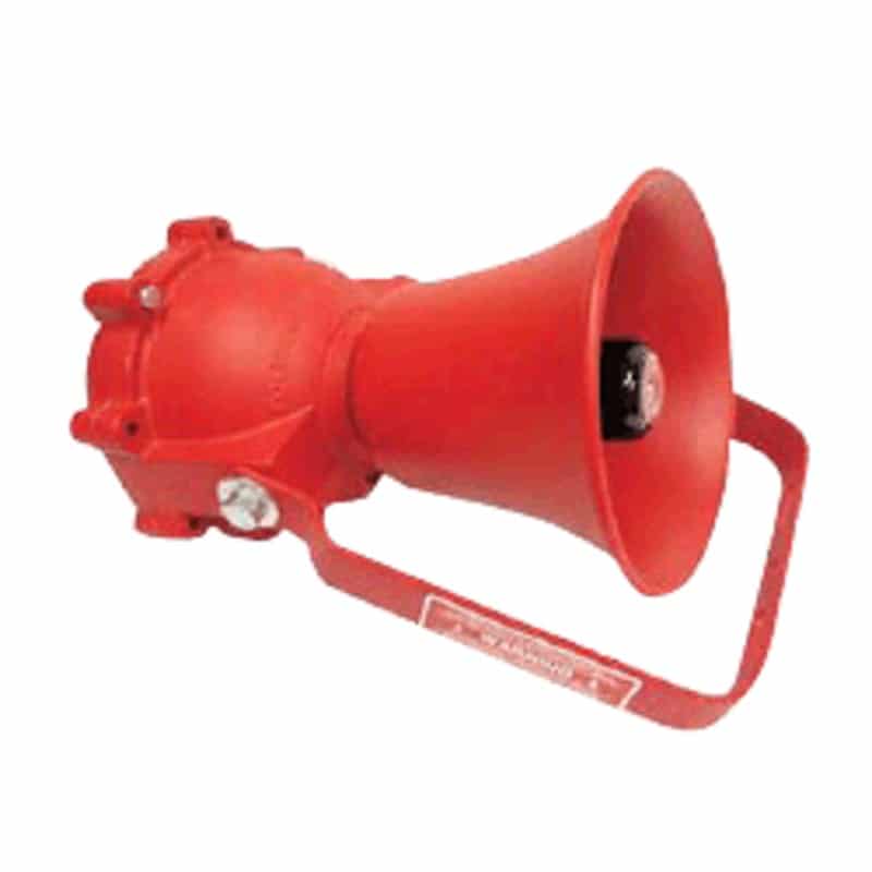 CPG Signals Model ASHX PowerTone Explosion-proof Amplified Speaker is designed for use in hazardous locations and produces a crisp clear high decibel tone. The tone may be generated by a voice or tone generating system by a compact, solid-state, plug-in card. Speaker cone and projector are of spun aluminum, the circuitry, speaker driver and tone card are contained in an explosion-proof housing.