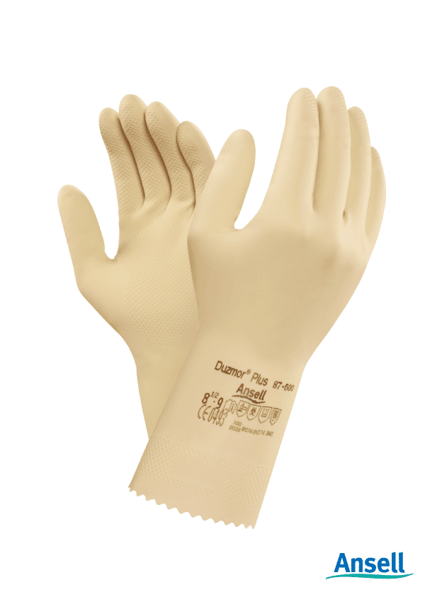 Ansell Duzmor Natural Rubber Latex Unflocked liner, fishscale grip design, pinked cuff, natural, 305mm, 0.43 thickness.