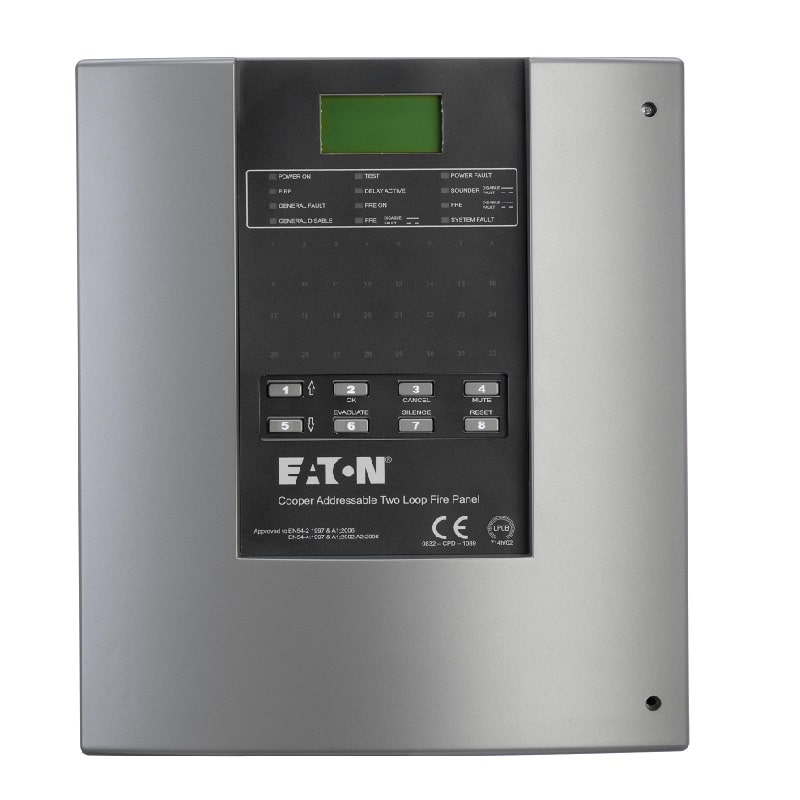 The Eaton Cooper CF2000GCPD panel is an entry level intelligent addressable control panel which can be configured for either 1 or 2 loop operation. It serves as the optimum solution for buildings that require a simple to use addressable fire system with a single, non-networked panel.