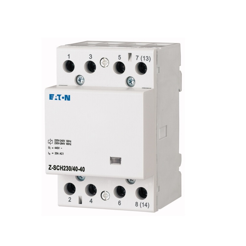 Eaton Z-SCH230/40-40 Installation Contactor, rated control circuit voltage 230V AC, rated operational current at AC1 40A, function: 4 N/O, details according to IEC 61095, EN 61095, VDE 0660, IEC 60947-4-1_x, EN 60947-4-1, VDE, standard front dimension 45 mm, mounting width 3 SU (52.5mm), top-hat rail mounting