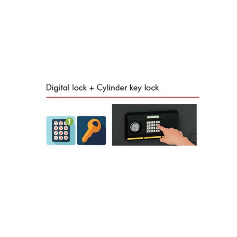 The digital & key lock safe is a high-security, fire-resistant safe for the protection of valuables and confidential or private documents. These electronic lock safes offer optimal security for your possessions as well as an easier, up-to-date keypad where you can insert your own personal code. Suitable for storing important documents and valuable items at home or in the office.