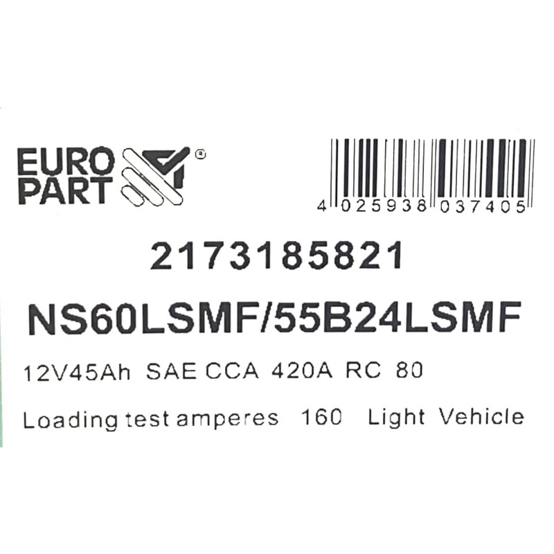Europart – Maintenance Free Car Battery 12V 45Ah – 55B24LSMF / NS60LSMF