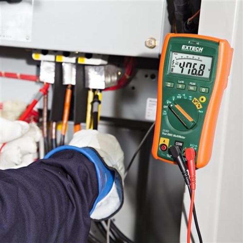 The EX365 is a Compact Industrial True RMS MultiMeter with a Built in Non Contact Voltage Detector. Featuring highly accurate True RMS measurements, LoZ for the prevention of false readings caused by ghost voltages, .5% basic accuracy, a 1000V AC/DC volt range, resistance up to 40M?, continuity beeper with visual alert, smart data hold, peak hold, auto power off with disable, relative mode for capacitance zero and offset adjustment. Additionally, the EX365 excels in frequency and capacitance measurements as well as commercial applications which require AC/DC current measurements from 1 mA to 10A. Complete with test leads, 9V battery, holster with tilt stand and built-in magnet.