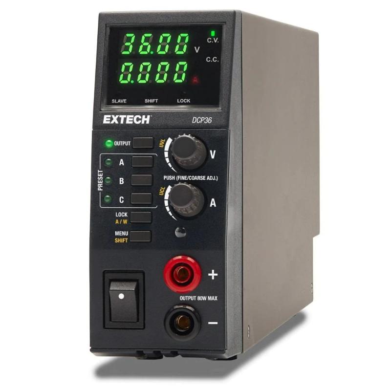 Extechs DCP36 power supply has 80W constant power topology and has autoranging Voltage and Current output. This compact and lightweight unit provides easy portability, and is ideal for tight workbenches with limited space. It features 4-Digit LED displays, 3-programmable presets, front/rear output terminals, and remote sensing for accurate applied voltage at load point.