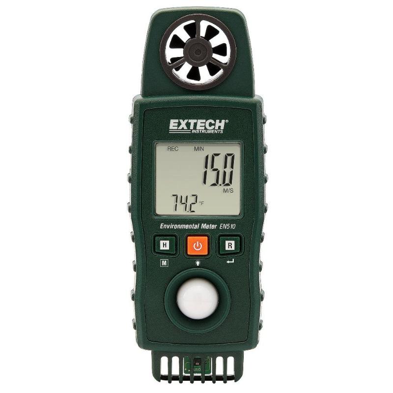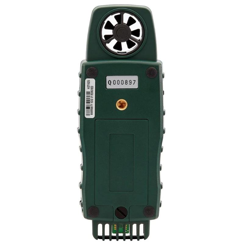 Convenient 10-in-1 Environmental Meter measuring Air Velocity, Air Flow, Air Temperature, Type K Temperature, Heat Index, Humidity, Wet Bulb, Dew Point, Windchill, and Light Level. Includes built-in low friction ball bearing mini vane wheel, a precision photo diode with cosine and color correction filter, and a capacitive humidity sensor for high accuracy. The Type K input accepts standard Type K Thermocouple probes to measure surface temperature up to 2372°F (1300°C). Features large dual LCD with backlighting, Data Hold, and Min/Max function.