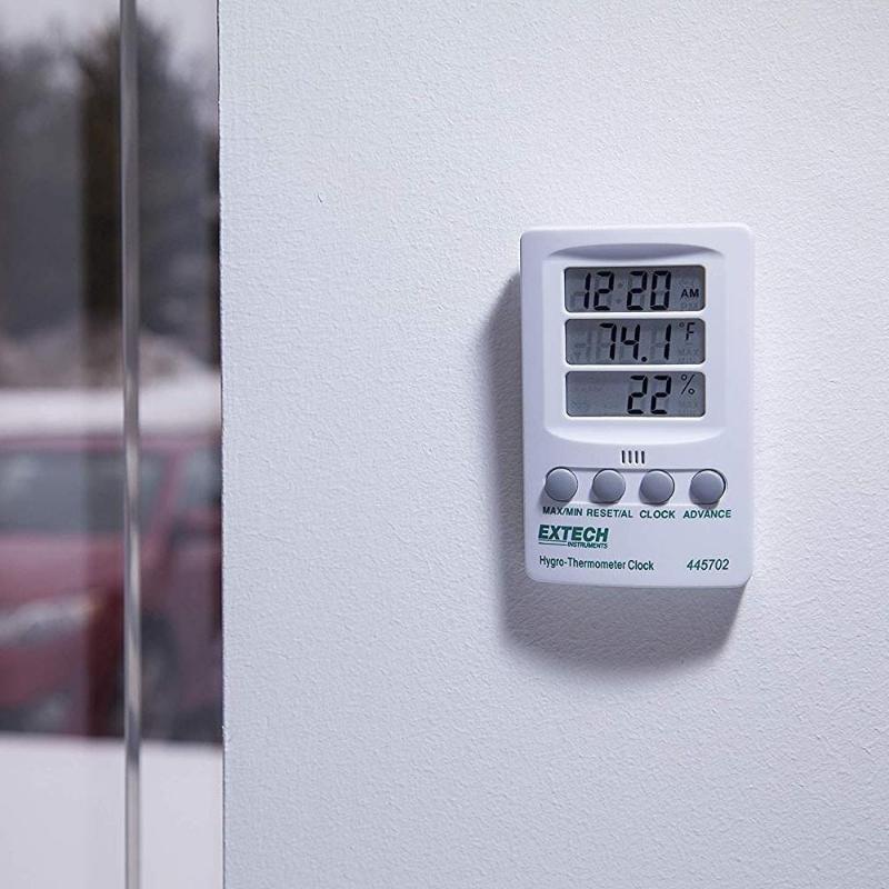 The 445702 combines 3 displays for Time, Temperature and Humidity. Clock displays 12/24 hour time. Maximum/minimum with reset function. Humidity: 10 to 85%. Temp: 14° to 140°F or -10 to 60°C. Accuracy: ±6%RH; ±1.8°F,±1°C. Complete with built-in tilt stand, wall mounting bracket and AAA battery.