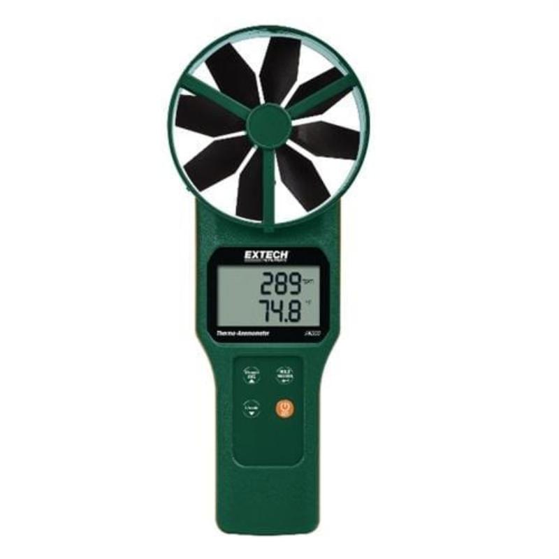 The AN300 is a Large Vane CFM/CMM Thermo-Anemometer. This meter measures Air Velocity, Air Flow and Temperature. ExtechÂ’s Large Vane Thermo-Anemometer series allows for more precise readings on larger size ducts. Each meter simultaneously displays Airflow or Air Velocity and Temperature. Complete with 4 AAA batteries and hard carrying case.