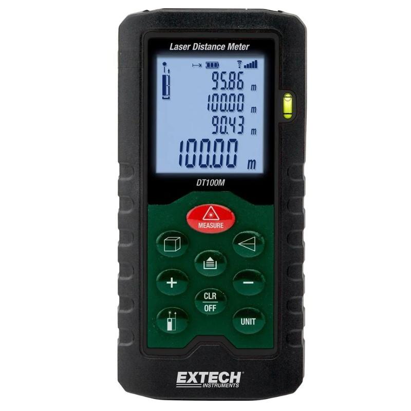 Extechs DT100M measures distance up to 330ft (100m). It can calculate area and volume and the integrated Pythagorean Theorem allows the user to take indirect measurements. Other features include continuous measurement with Min/Max distance tracking, 20 point memory, addition/subtraction of sequential readings, front or rear edge reference, and a Stakeout function. Large quad backlit LCD display and double molded housing. It also has a handy built-in bubble level and comes with a wrist strap and batteries.