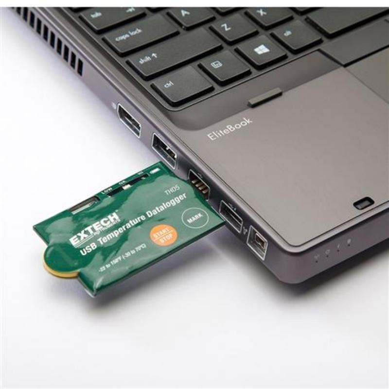 The THD5 are portable, one-time use USB Temperature Data loggers with USB Connection. Convenient credit card-sized housing with USB 2.0 connector and NTC thermistor for one-time use in datalogging accurate temperature measurements. User programmable settings: language, sample rate, start delay time, alarm delay time, high/low alarm range, and security feature. Status Indication via Red and Green LEDs. Start button begins continuous datalogging, which continues until memory is full at 8192 readings, or when Stop button is pressed. Bookmark 8 locations in a data recording log with a press of the Mark button. Automatically generates a PDF report with data and trending graph when plugged into a PC after datalogging is completed. Long battery life (approx. 1 year). Complete with 10 datalogging units (each with a CR2032 button battery and plastic bag).