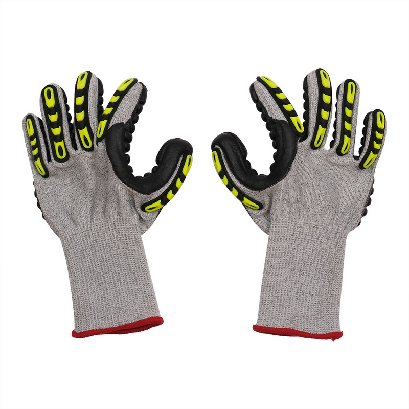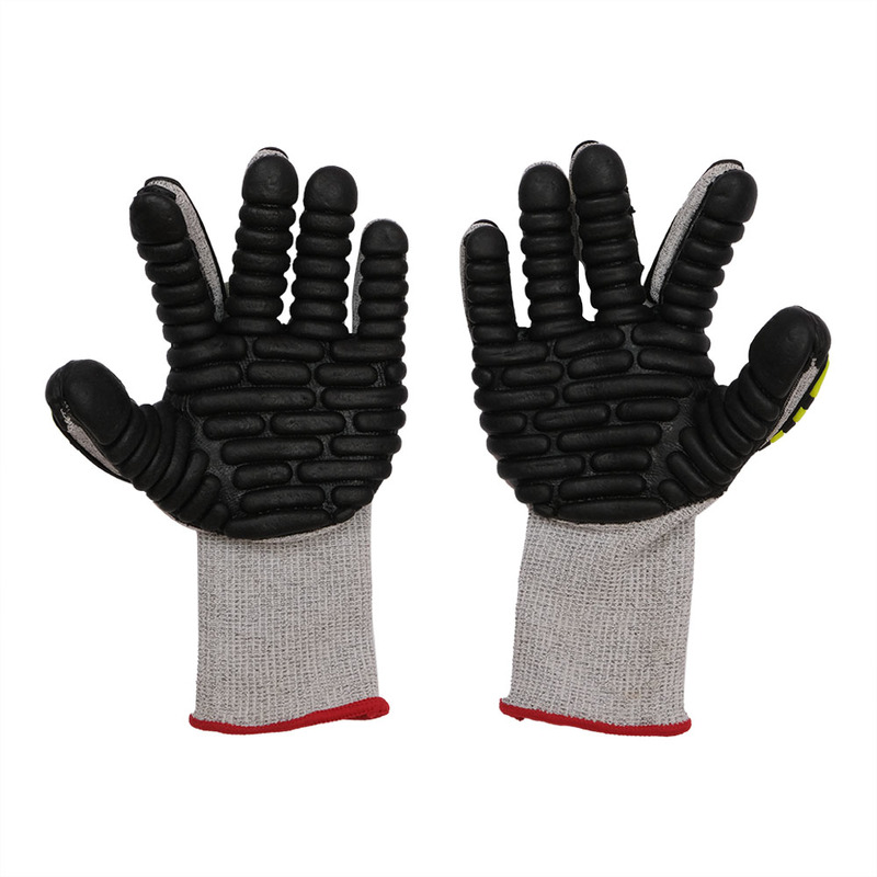 Anti- cut, anti-vibration. Abrasion resistance and anti puncture. Environmental and non pollution. Unique chloroprene rubber palm pad. Light weight, breathable 7-gauge cotton/nylon seamless knit construction. Pre-curve design provides comfort, dexterity, and flexibility with elastic cuff for security fit.