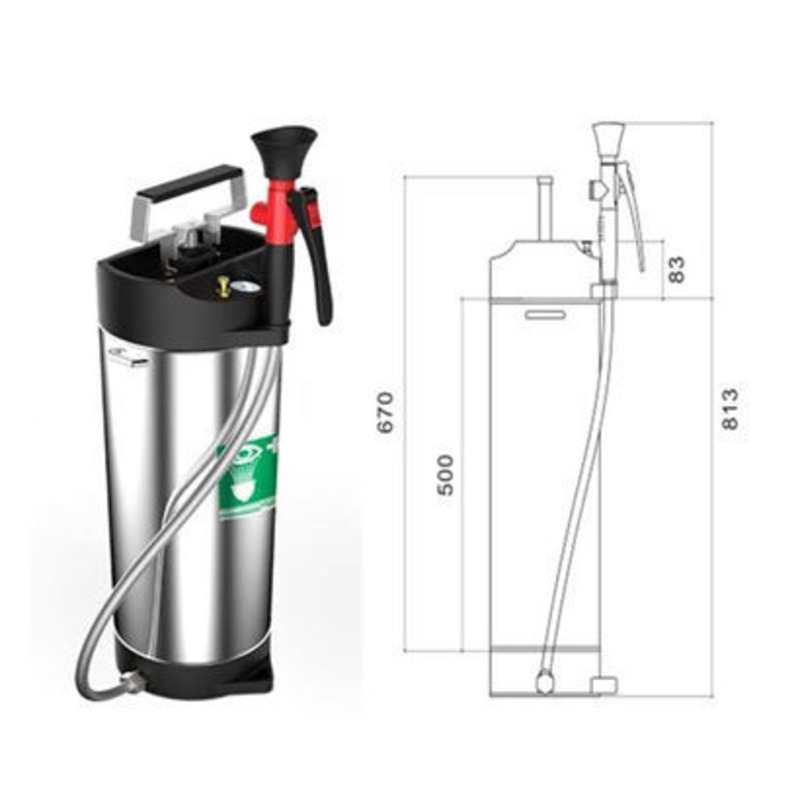 Portable eye wash is made of 304 stainless steel, equipped with pressure reducing valve to keep the water flow stable. Add 10 Litre pure water when in use. Change the water and add air every 90 days. Push 50 times 3Mpa by hand to add air pressure. Water flow last more than 15minutes.