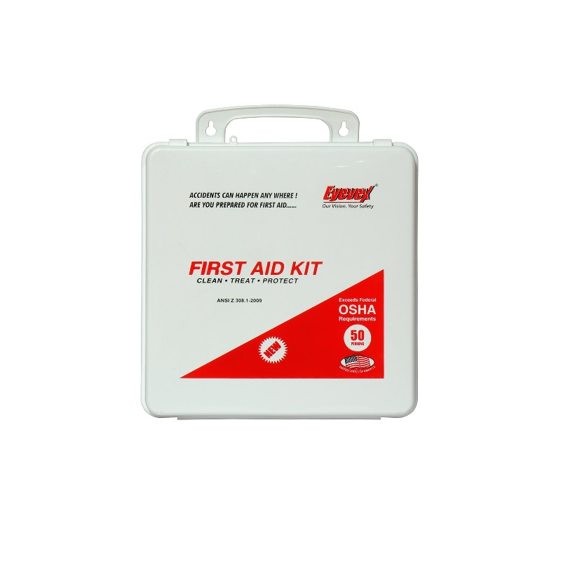 Eyevex First Aid Box Kit 50 Person ideal for contractors, fleet vehicles, worksites or small companies with up to 50 employees. It meets federal OSHA recommendations and carries 20 critical products including a 4 oz. eyewash and 6-piece CPR kit. The rugged metal case is wall mountable yet has a handle for easy carrying.