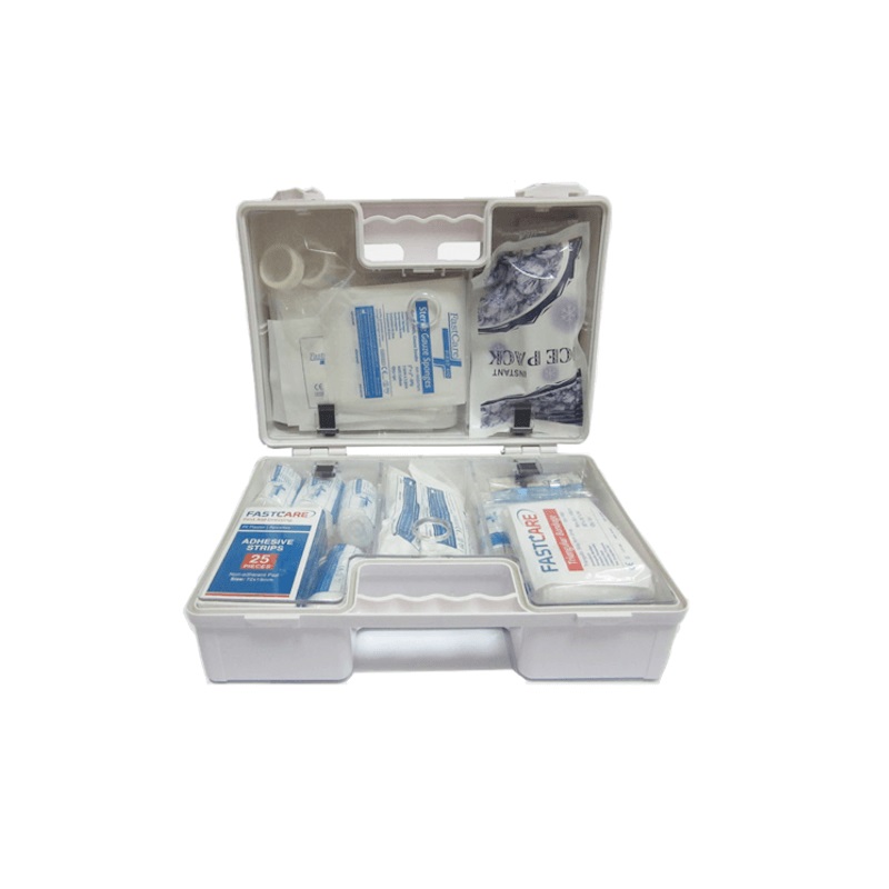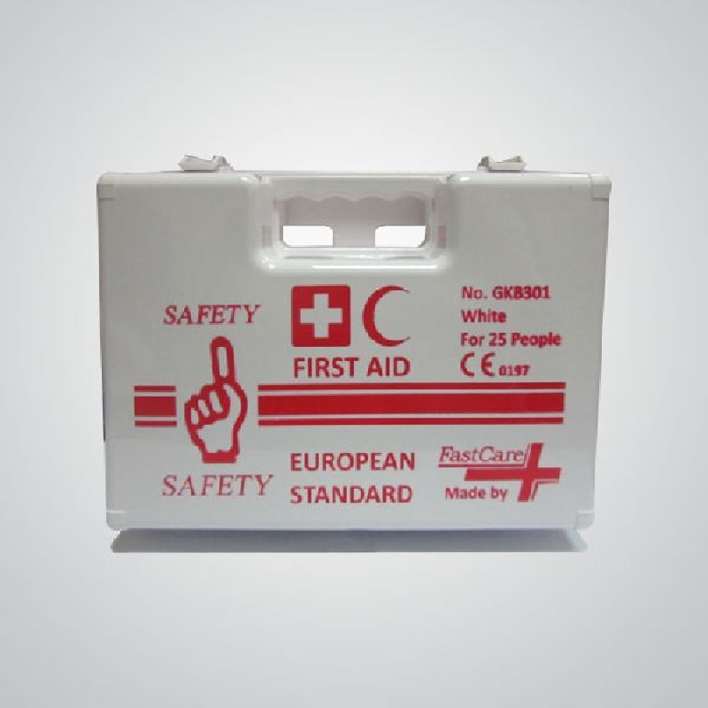 FastCare GKB 301 First Aid Box Kit For 25 People made of strong ABS plastic which is shiny, smooth, and easy to clean. The kit contains a neoprene seal which makes the kit dustproof. The wall bracket is able to secure the kit on a common house wall. The internal crystal partitions permit a more flexible and scientific item arrangement. Additionally, two swivel catches are set for closing security. Recommended use: business companies, small factories, workshops, labs, and etc