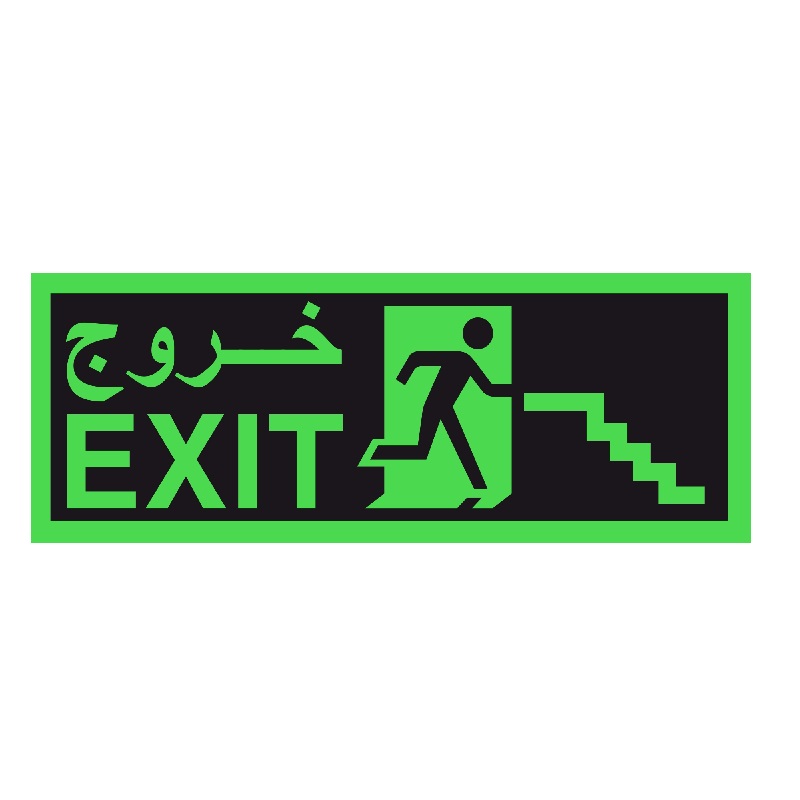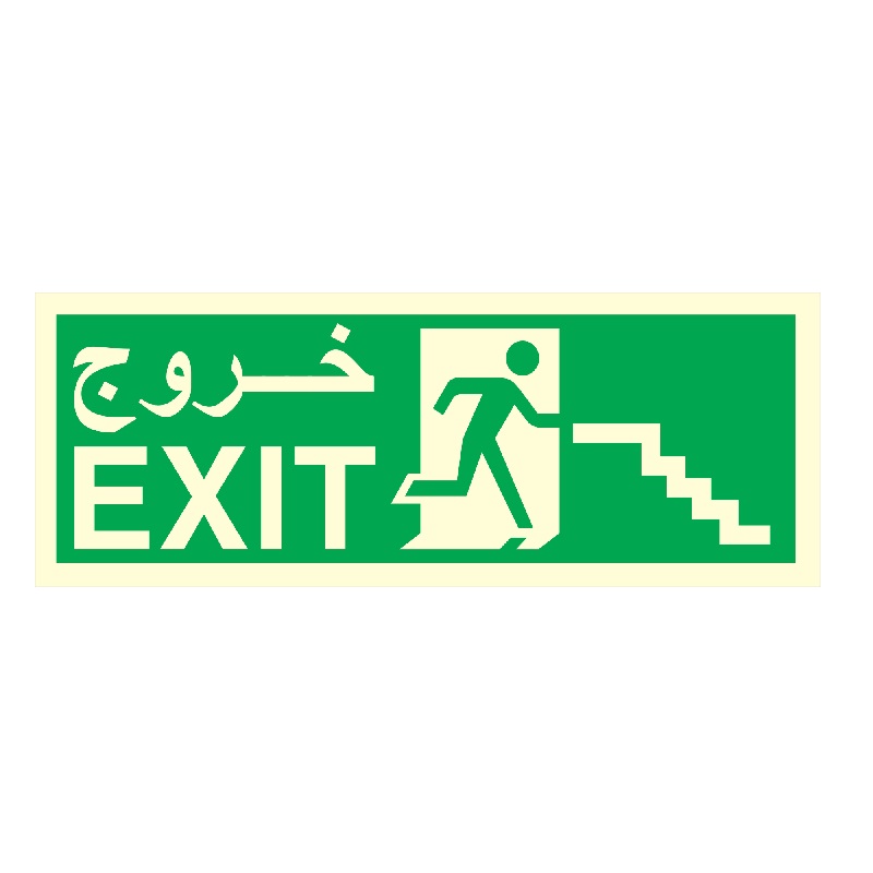 Fire Exit Sign Stairs Arrow Self Adhesive Sticker is designed to identify escape routes in a fire emergency. Rectangle shape with a white pictogram on a green background. Easy to apply.