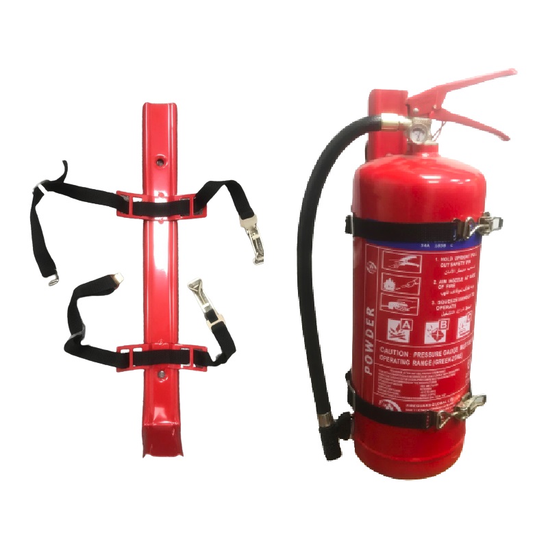 Fire Extinguisher Bracket L Shape Strap suitable for vehicles and for Hanging cylinders on the wall. This Extinguisher Bracket consists of L Shaped Metal Frame to place an extinguisher on it, belt to hold the cylinder.