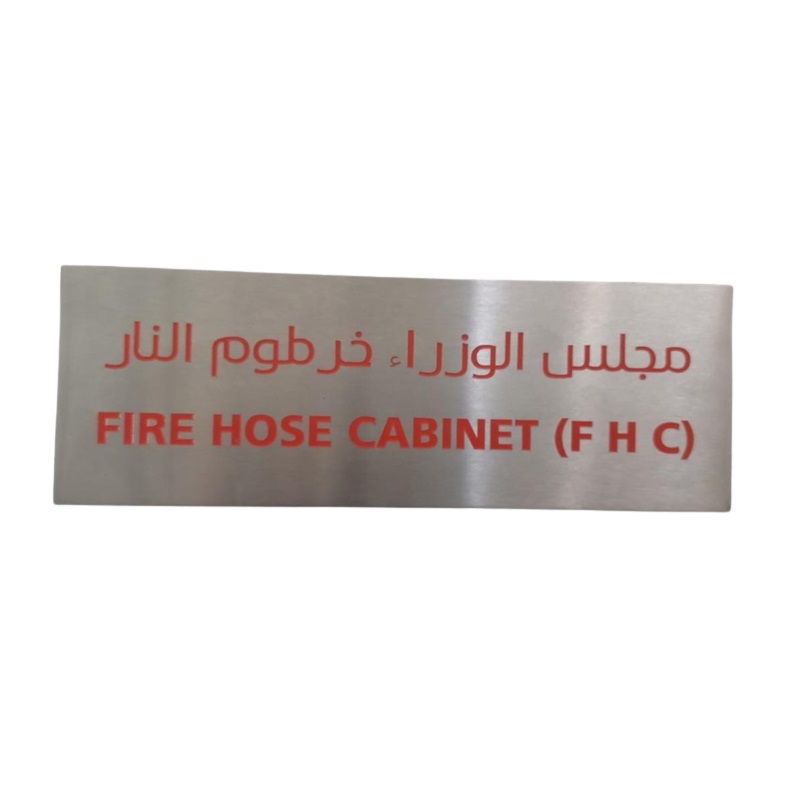 Fire Hose Cabinet Sign Metal Plate – English & Arabic Letters, Fire Hose signs are placed around the area where the fire hose is located. A fire hose is a high-pressure hose that carries water or another fire retardant (such as foam) to a fire to extinguish it. Outdoors, it attaches either to a fire engine or a fire hydrant. Indoors, it can permanently attach to a building’s standpipe or plumbing system.