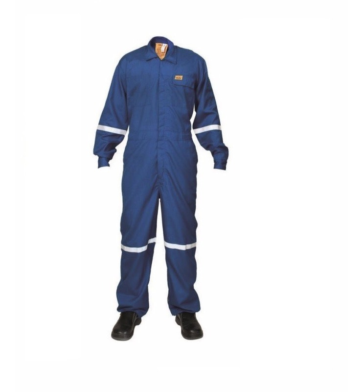 100% cotton FR Nomex coverall Royal Blue 3XL. Flat coat collar. Two flap chest pockets with snap buttons. Pen pocket on left sleeve. Two back pockets, one with flap. Tool pocket on right leg. Two trouser pockets. Elasticized back. Hanger loop on collar. Concealed snaps on cuffs and ankle openings. Concealed two-way FR Tex zipper with brass snap closure. FR Reflective tape on arms, legs and upper body. Bartacking done in places where more strength is needed to support extra load.