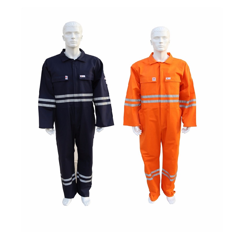 Fire Warrior FW2250(2260) Flame Retardent 100% Cotton Work Wear Coverall with two front chest pockets with flap closer with concealed metal snap buttons. Two back pockets with flap closer with flap closer with velcro. One tool pocket on the right leg, two side cross pockets provided white pocketing fabric. Two-way heavy-duty metal brass zipper in front.