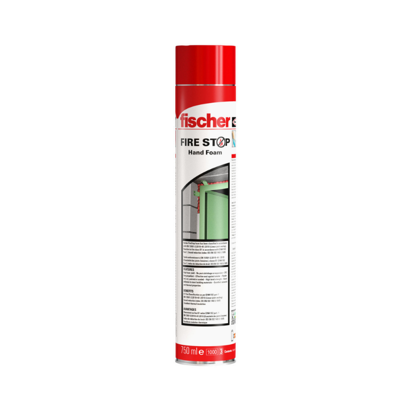 The FISCHER fire stop foam spray expands to fill irregular gaps around pipes, cables, and ductwork. Provides smoke and fire resistance (up to 240 minutes) while maintaining flexibility. Suitable for both horizontal and vertical applications in walls/floors.