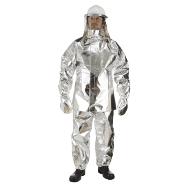 Flameguard MK3 Aluminized SOLAS Fire Fighter Suit is a two-piece garment constructed in aluminized fire-resistant modacrylic cotton. The jacket has a stand-up collar, elasticated cuffs and is closed by a 50 mm wide touch and close fastening to the front and collar. The trousers have 25 mm webbing braces with plastic adjusters to fit a wide range of wearers and the lower leg is elasticated. The gloves are made from aluminized fire-resistant modacrylic cotton backs and fire-resistant cotton palms and are worn over non-conducting gloves. The helmet assembly comprises a safety helmet to EN397 fitted with a fabric neck-curtain and a replaceable 2 mm heat and impact resistant polycarbonate visor. The visor can be flipped up and a chinstrap is fitted to secure the helmet. SOLAS-approved boots from sizes 42 – 46 with protective toecap are also provided.