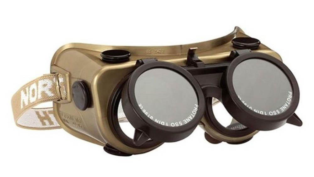 Can be worn over normal glasses. Switch quickly between welding and grinding. Flip-up welding goggles (clear polycarbonate lenses inside)