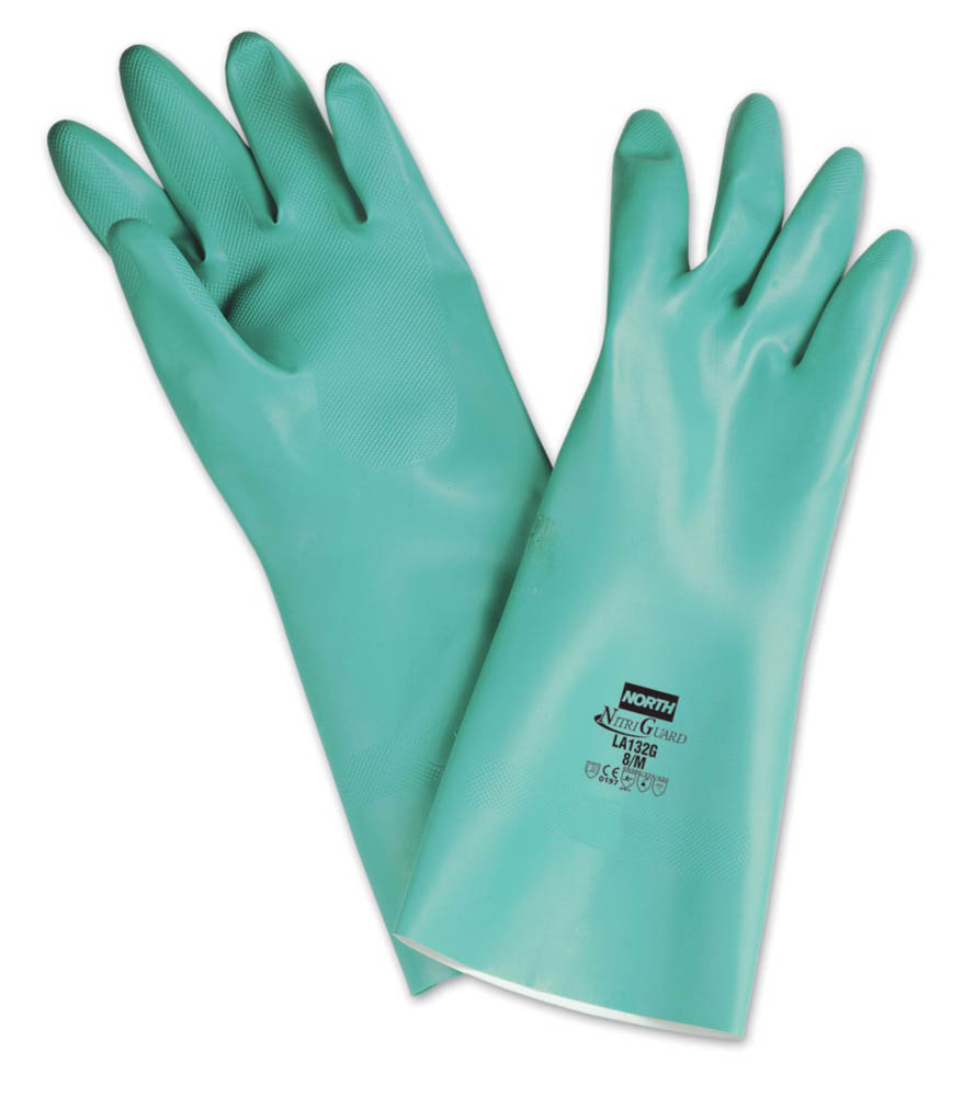 Honeywell Nitri-Guard Plus™ Size 10 Flock Lined Green Chemical Resistant Gloves with straight cuff are made of 15 mil nitrile that provide great resistance to cuts, snags, abrasions and punctures.