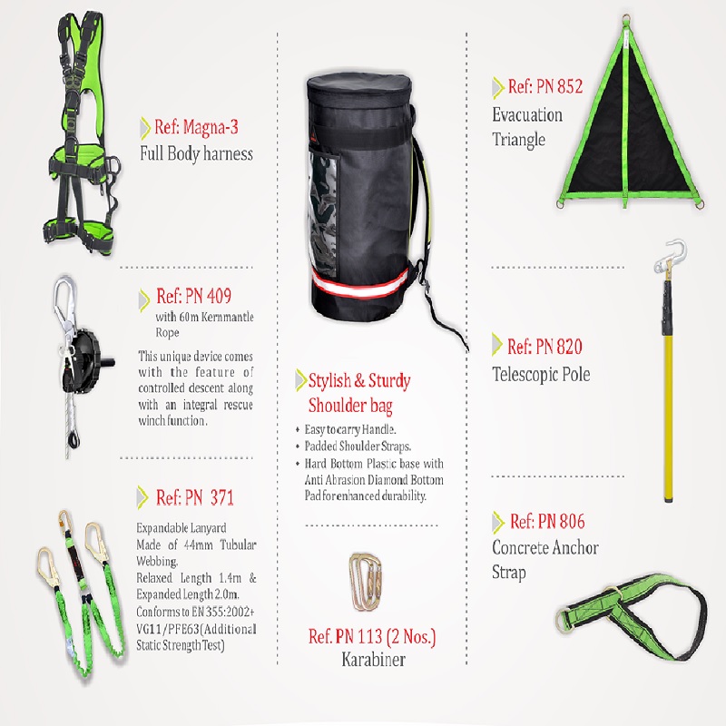 Karam PN662 Provides a range of Self Contained Rescue Kits for ready use in various applications. The Kits contain standard equipment and can be customized as per specific needs. This Rescue Kit consists of Full Body Harness (Magna-3), Kernmantle Rope (PN 409), Stylish & Sturdy Shoulder Bag (BG 20), 3Pcs of Karabiner (PN 113), 14mm Anchorage Rope of 50mtr length (PN 950), Knife, Double Lanyard (PN 371), Work Positioning Lanyard (PN 242)