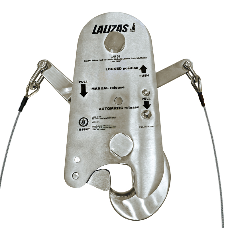 The LALIZAS Release Hook LAR 36 is an off-load release hook, that combines two modes of operation (automatic & manual) in one hook, suitable for davit launched liferafts & rescue boats, with a davit load up to 3670 kg/8091 lb. It is tested and certified according to SOLAS/MED provisions and LSA requirements. It has 2 possible modes of operation, allowing for safe evacuation regardless of the conditions: Automatic release mode: by activating the automatic release mechanism prior to splashdown, the hook will open automatically (with a force between 5-30 kg/11-66 lb) when the craft becomes waterborne. Manual release mode: when the craft is waterborne, but has not been auto-released (due to added load on the hook -less than 150 kg/330 lb – while being towed or due to bad sea conditions), then the manual release mode must be activated by the user. Remember that with this release hook, the actuating lever of the automatic release must be pulled prior to splashdown, for both automatic and manual release modes.