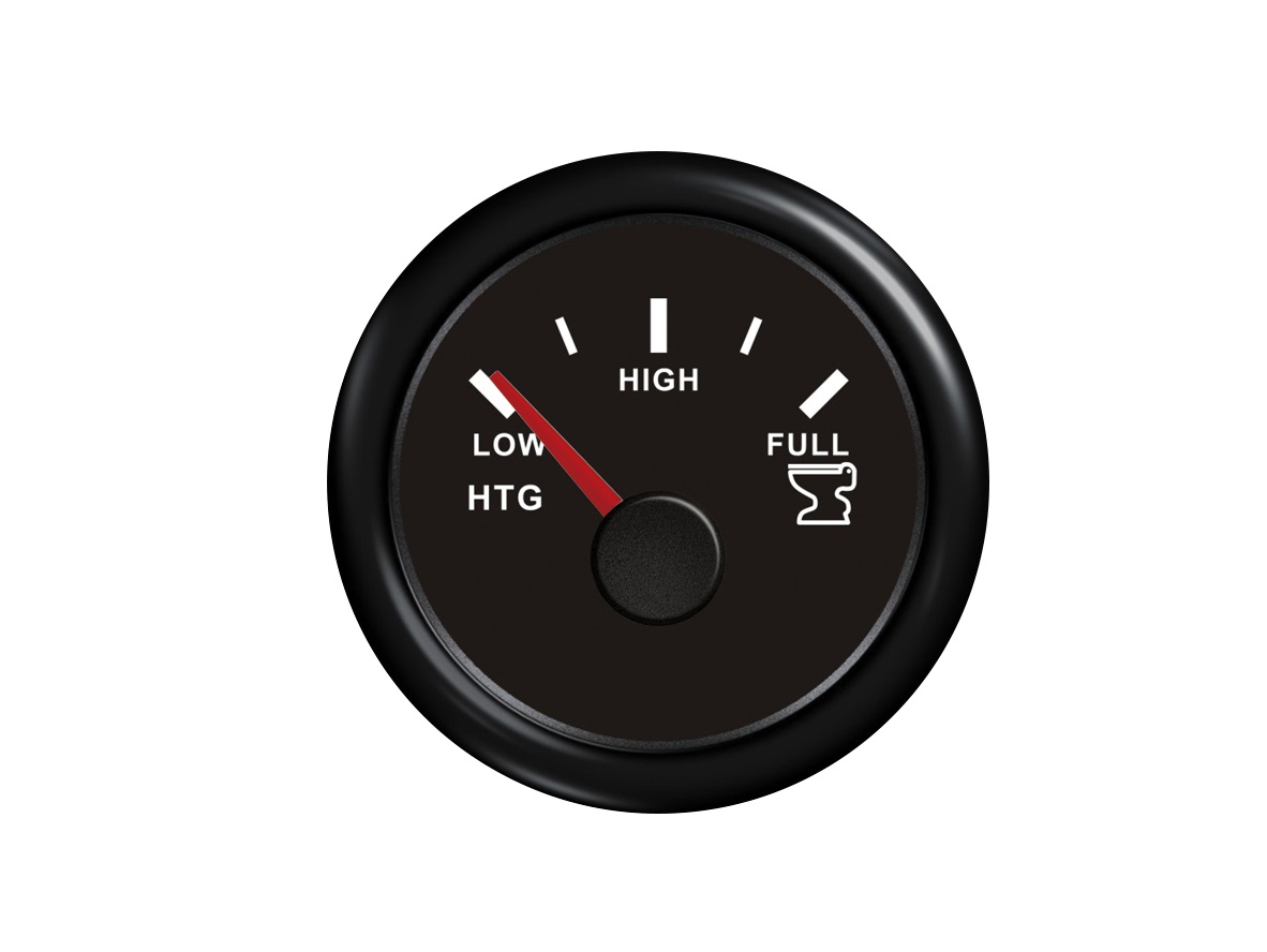 Waste water tank gauge, 52mm, black dial. Working range 240 – 33 ohms. The instrument housings of this series are protected according to grade IP 67. They deliver dust and water protection to a depth of one meter. Glass is double layored, which offers excellent protection against fogging. Installation is simple: Insert into a 52 mm drill hole and secure from behind with a union nut. Electrical connection via multi-plug connectors. All instruments with background light. Choose from red or yellow background light. Devices are designed to be used with 12 Volt. Operate in 24 Volt systems with a series resistor. The black dial is supplied with a black plastic bezel, the white dial with a white bezel. Bezels can be easily exchanged. Working range from approx. -40 C to +80 C.