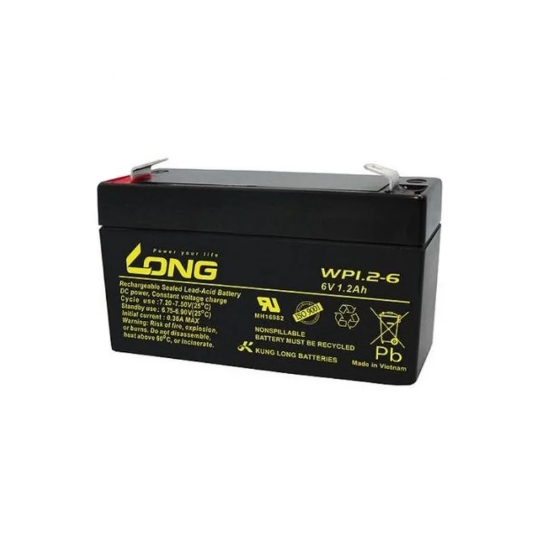 Long WP1-2-6 Rechargeable Sealed Lead Acid Battery of 6V, 1.2Ah/20Hr provides high performance and long service life. Compliant with the IATA/A67 and IMDG/238 requirements for transportation