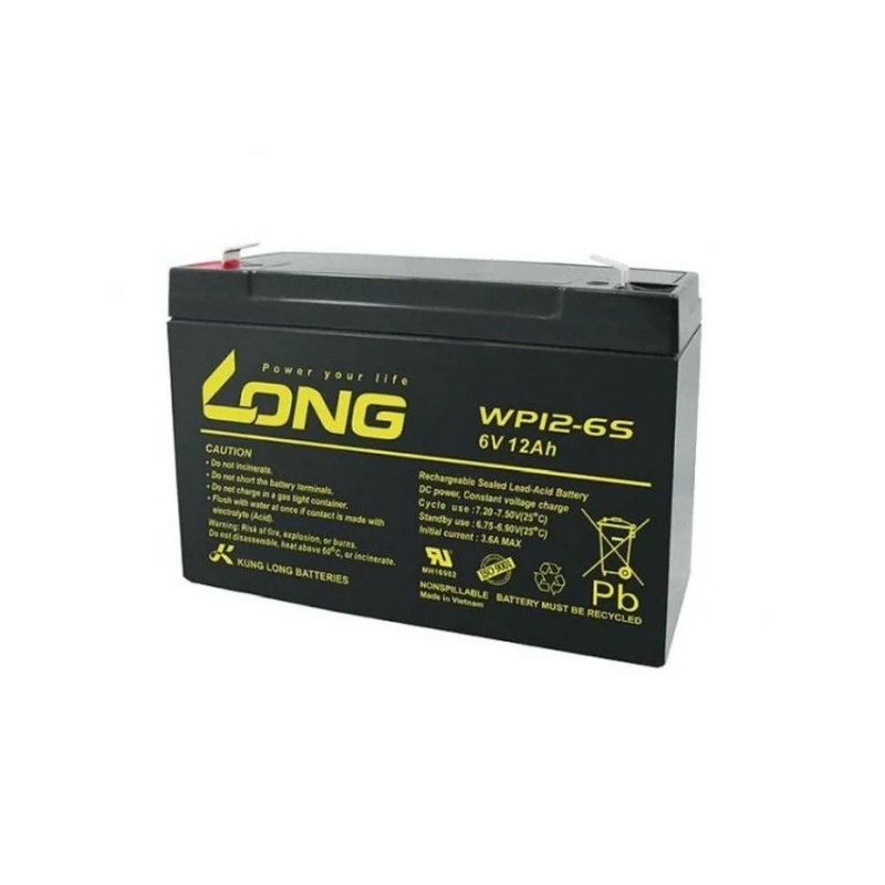 Long WP12-6s Rechargeable Sealed Lead Acid Battery of 6V, 12Ah/20Hr provides high performance and long service life. Compliant with the IATA/A67 and IMDG/238 requirements for transportation
