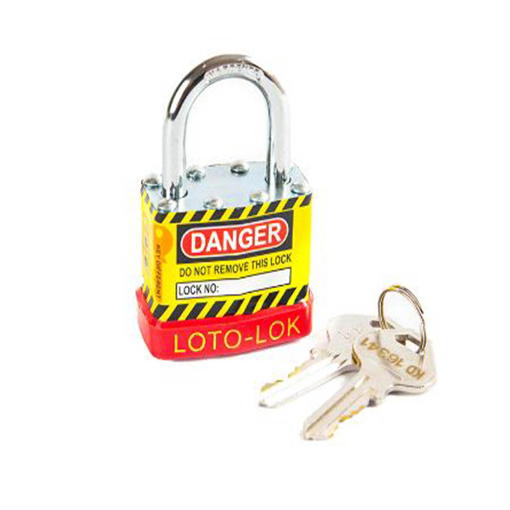 Loto Lok 2PTPSRKDS24 Laminated Steel Safety Lockout Padlock Red Laminated Steel Safety Lockout Padlock, Steel Body, REGULAR Shackle, with RED color Bumper. Laser engraved Key No. on Key and padlock body for easy identification.